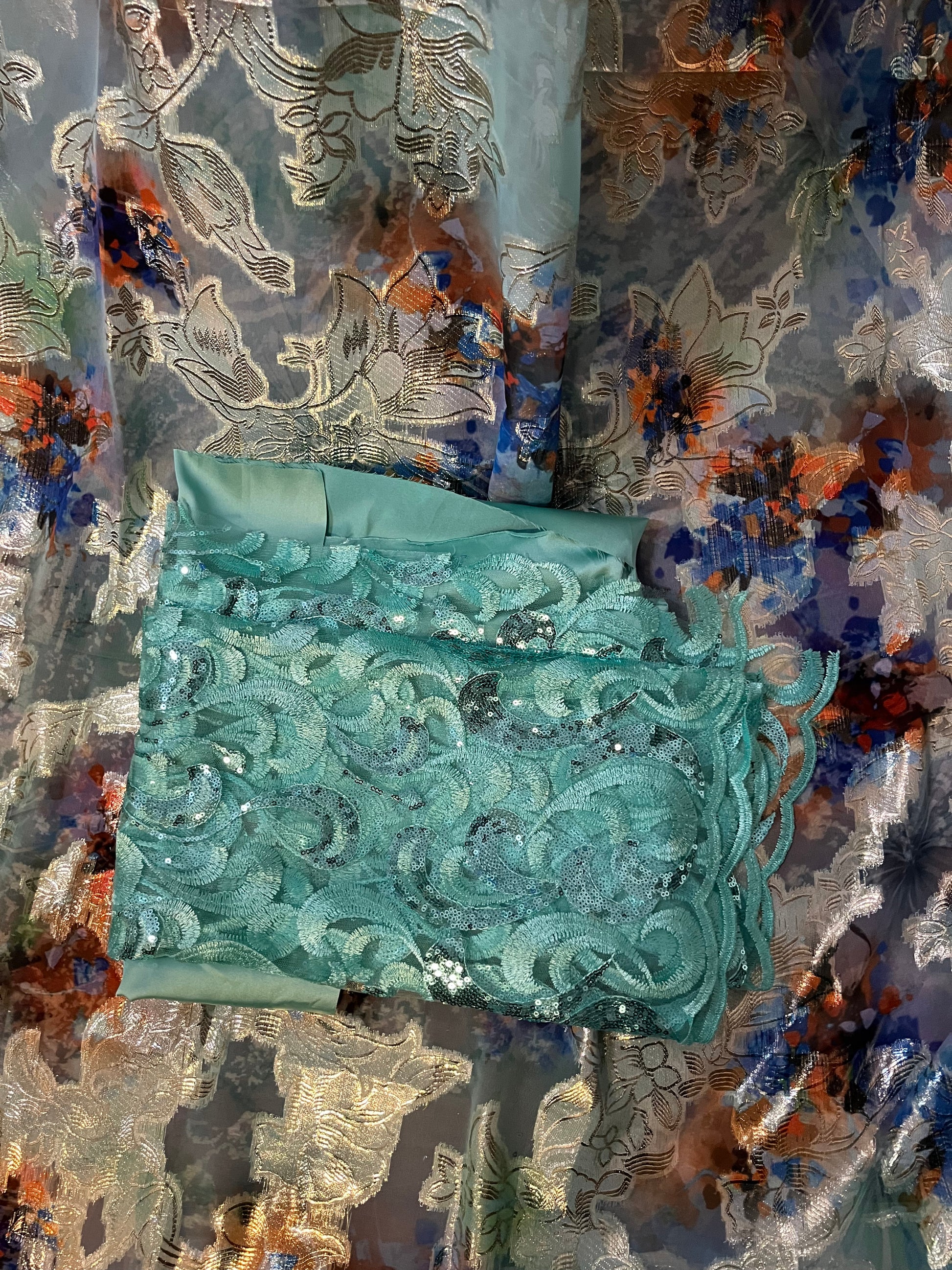 This Dirac set is paired with a gorgeous satin silk Gordgoro and a chiffon Gabasar to complete the look.