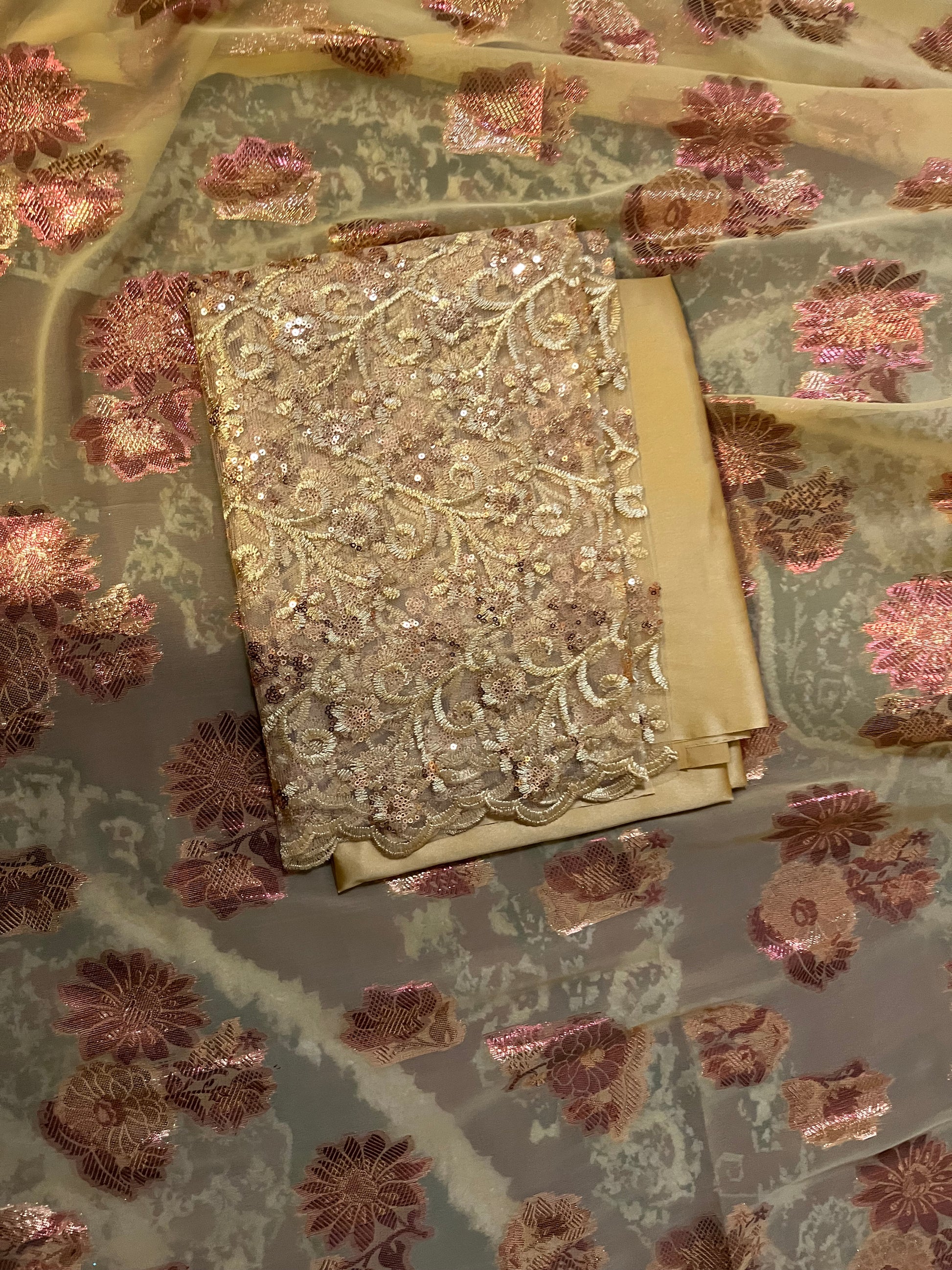 This Dirac set is paired with a gorgeous satin silk Gordgoro and a chiffon Gabasar to complete the look.