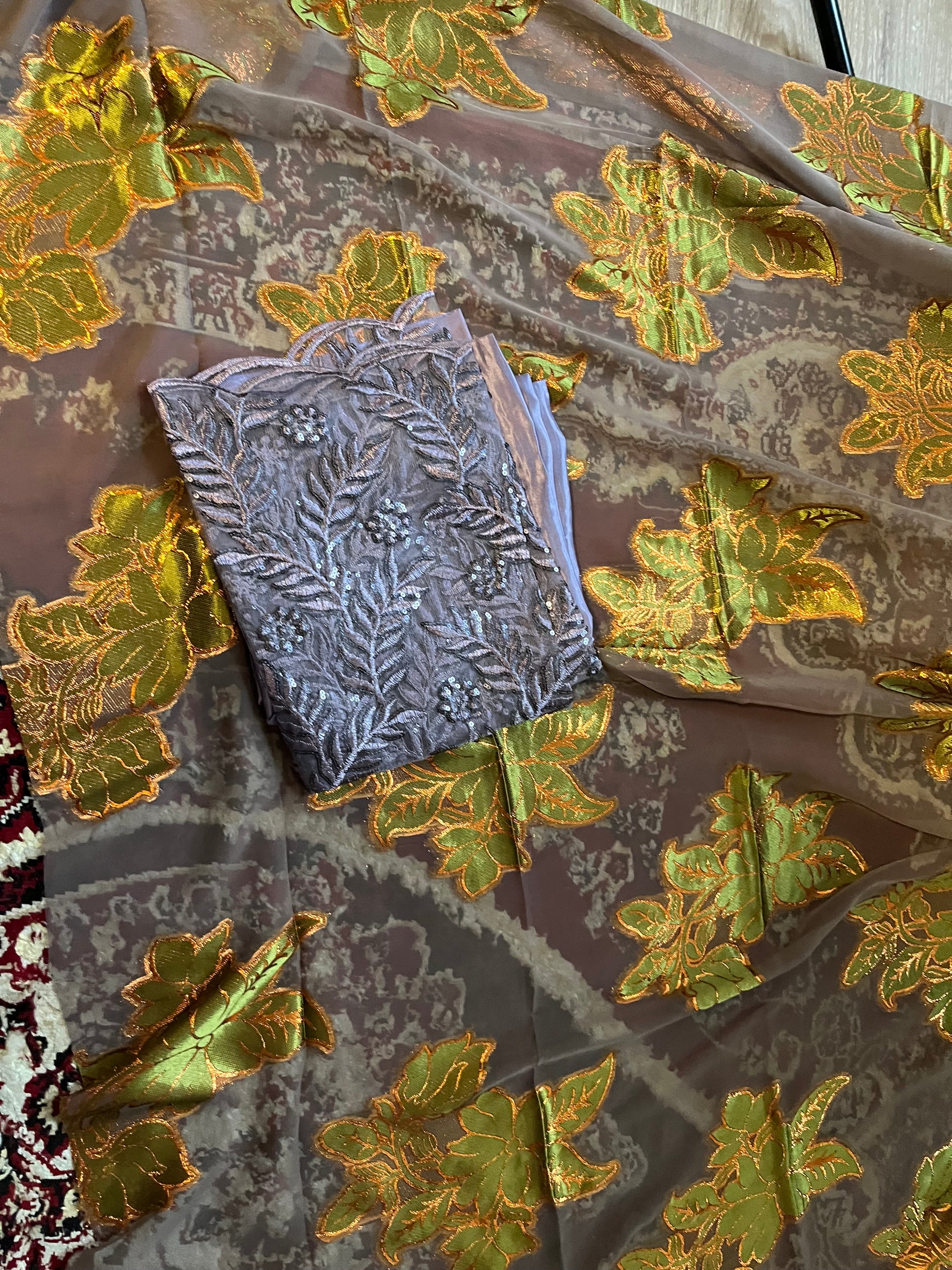 This Dirac set is paired with a gorgeous satin silk Gordgoro and a chiffon Gabasar to complete the look.